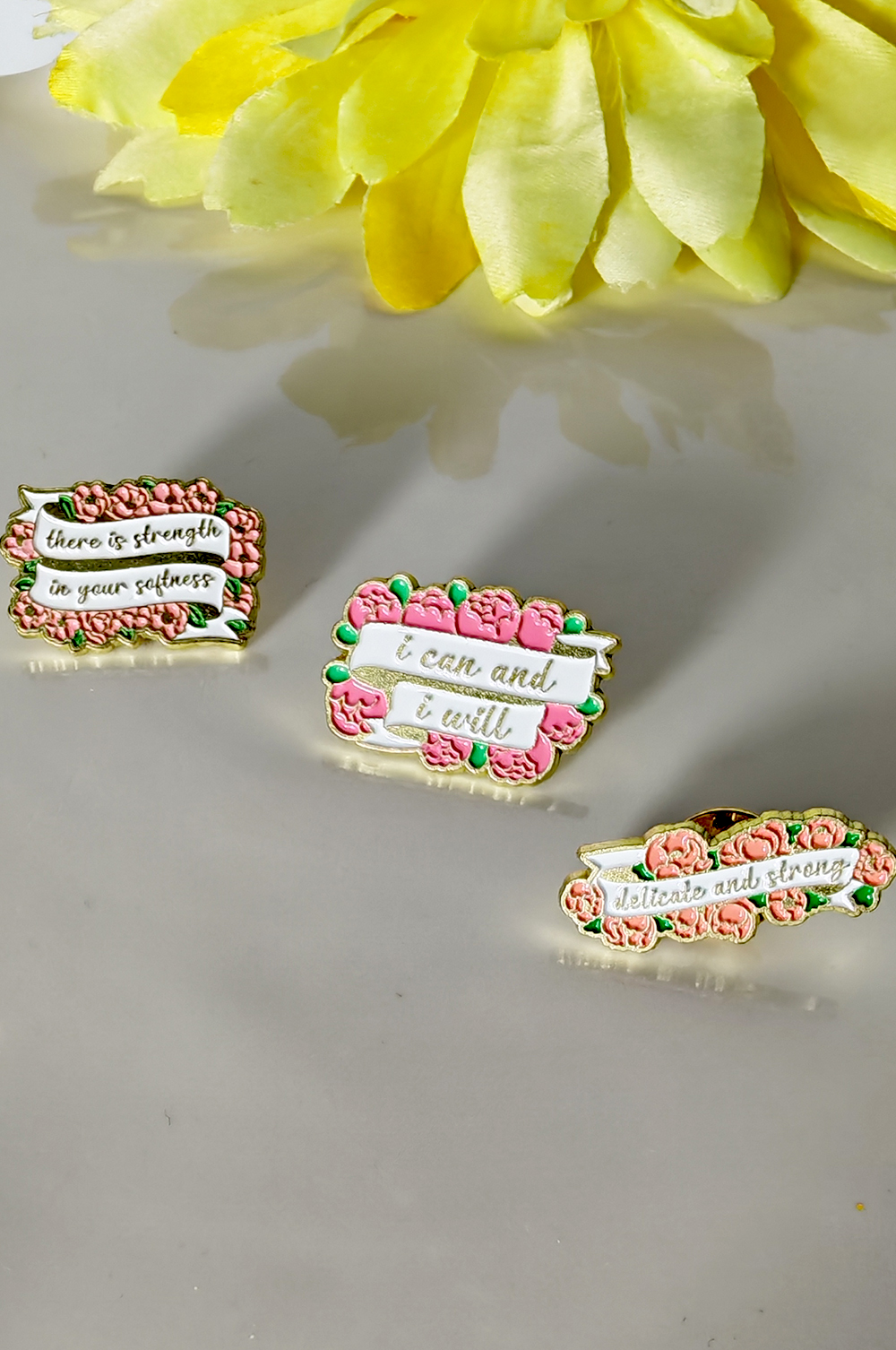 The Floral Affirmation Pins are delicate floral enamel badges designed to uplift, encourage, and inspire. Each pin features a positive affirmation framed with soft floral details, creating a feminine and meaningful accessory that serves as a quiet reminder of strength, hope, and self-belief.